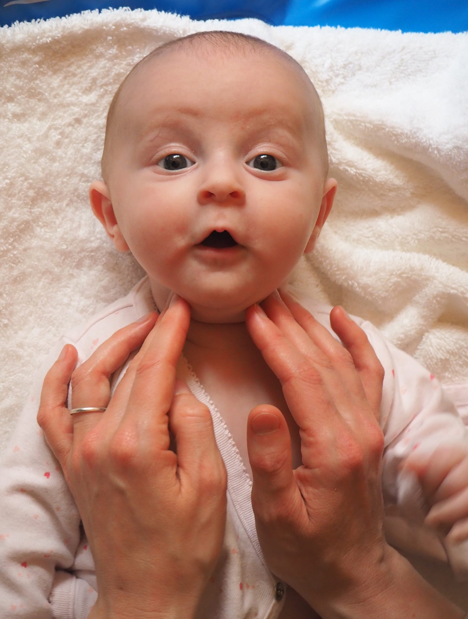 Ce sont les parents qui massent bébé, je vous montre des mouvements sur mon poupon qui pourront vous guider dans vos intuitions.